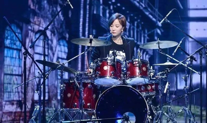 图片人物:王珞丹。明星中不乏有架子鼓爱好者,业余or专业,明眼人一看便知。