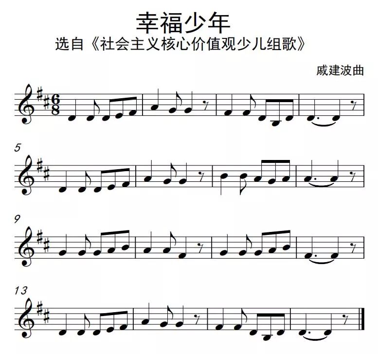 《幸福少年》,选自《社会主义核心价值观组歌》,由中国音乐家协会指导、威海市委宣传部组织创作推出,包含《富强歌》、《民主歌》、《文明歌》、《和谐歌》、《自由歌》、《平等歌》、《公正歌》、《法治歌》、《爱国歌》、《敬业歌》、《诚信歌》、《友善歌》、《幸福少年》、《快乐少年》14首歌曲。组歌主题鲜明、振奋人心、通俗易懂、旋律优美,符合少年儿童认知习惯,具有较强的艺术性、传唱性,是推进社会主义核心价值观具体化大众化生活化的有益探索创新。