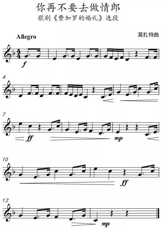 《费加罗的婚礼》(Le Nozze di Figaro)是莫扎特最杰出的三部歌剧中的一部喜歌剧。《你再不要去做情郎》出现在第一幕结尾部分。剧情发展到音乐老师巴西里奥帮助伯爵发现躲藏在苏姗娜房间里的童仆
